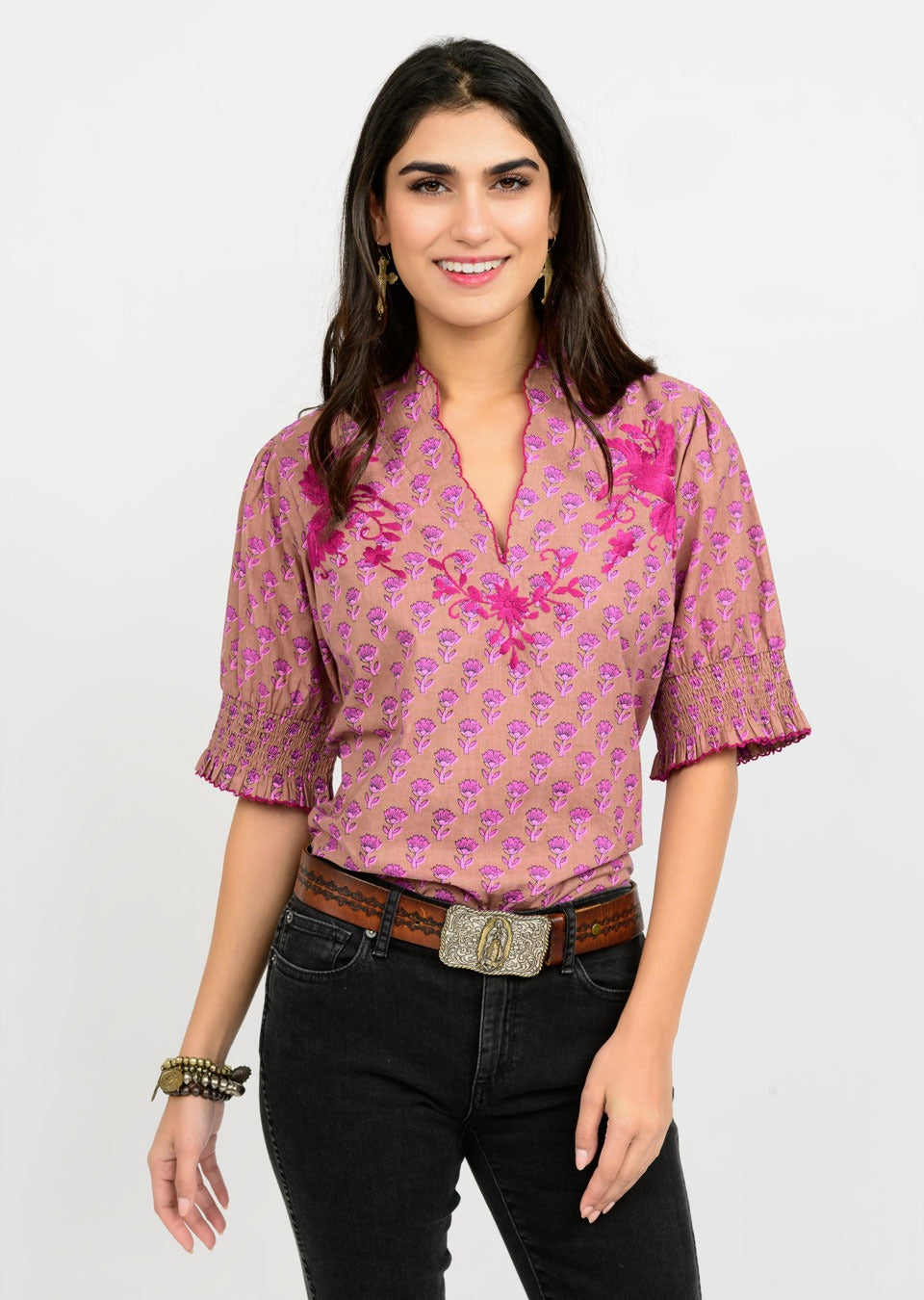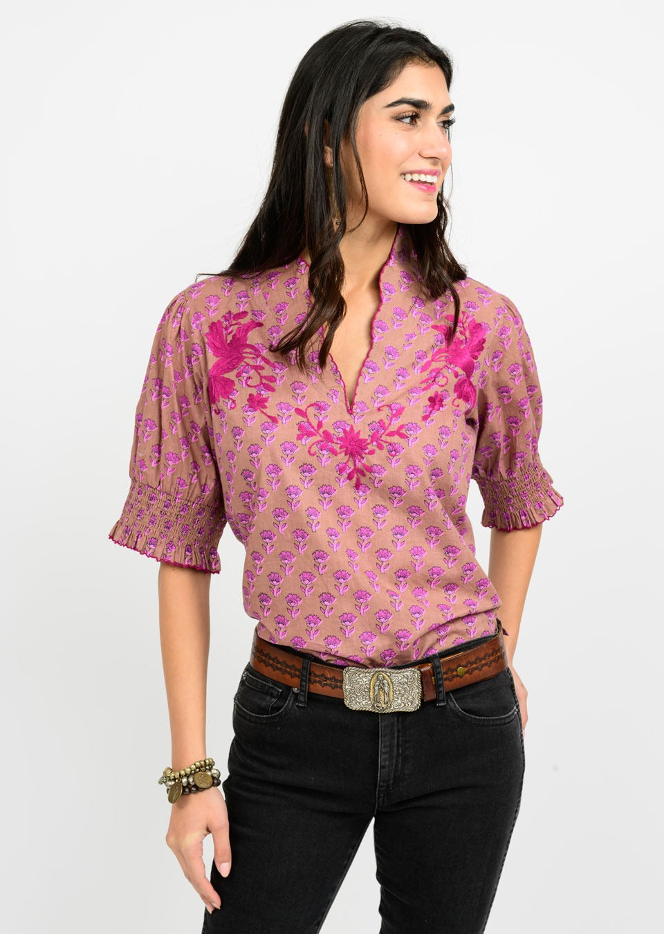 Brighten your wardrobe with the Elenor by Ivy Jane, featuring a charming plum colored cotton print and delicate embroidered neckline. Its short puff sleeves and flirty V-neck add a playful touch, making it perfect for sunny days and fun outings. Light, comfy, and effortlessly stylish!
