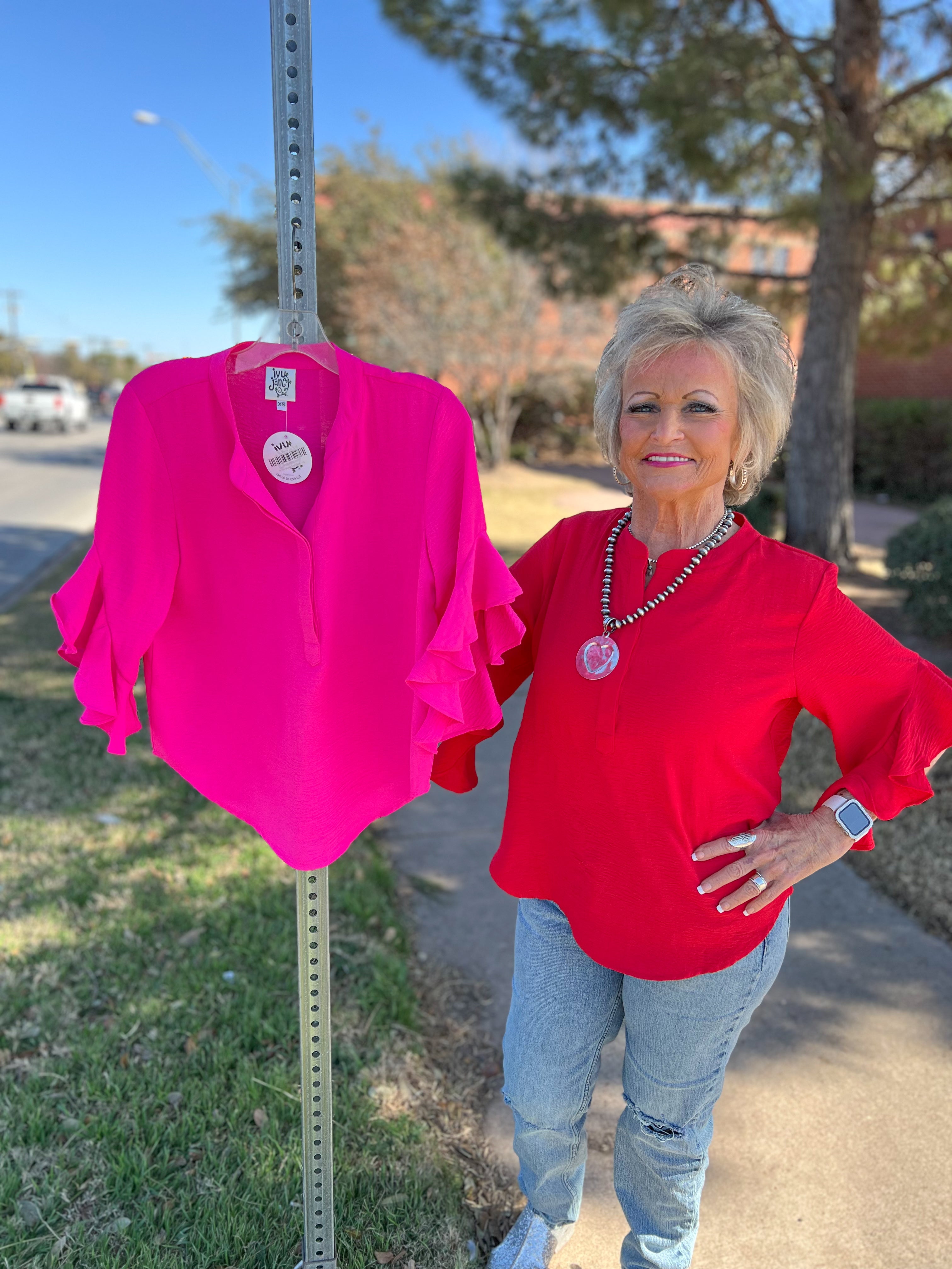 Effortlessly transition from day to night with the Ivy Jane Flutter Sleeve Top. This playful and feminine pink top is perfect for any occasion, from casual outings to cocktail parties. Elevate your holiday fashion game with this must-have, oh so flattering piece.