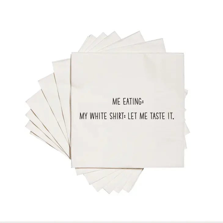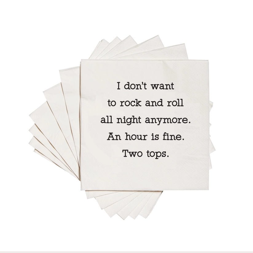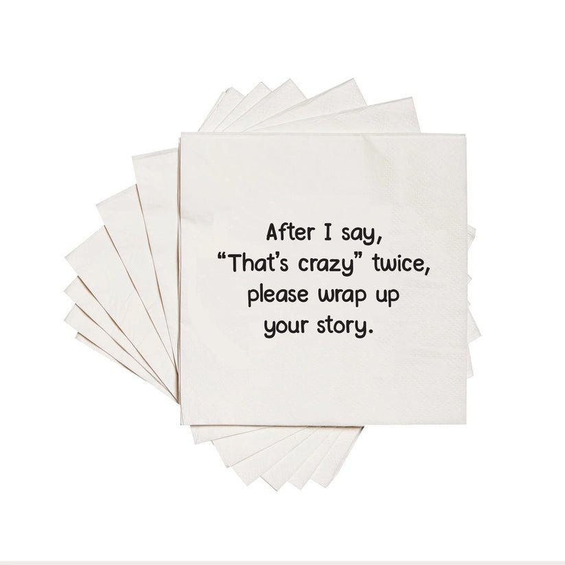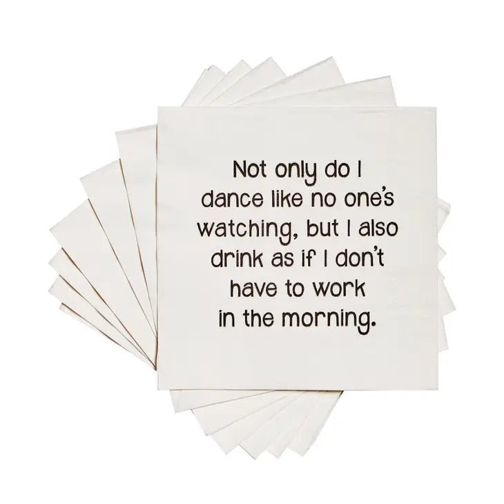 3-ply, 5x5 folded, white napkins are printed with crisp black ink. They come cellophane wrapped in packs of 20, and we think they're some of the funniest on the market! Why not add a little sass to your next cocktail party?! They even make a great hostess gift with a bottle of wine!