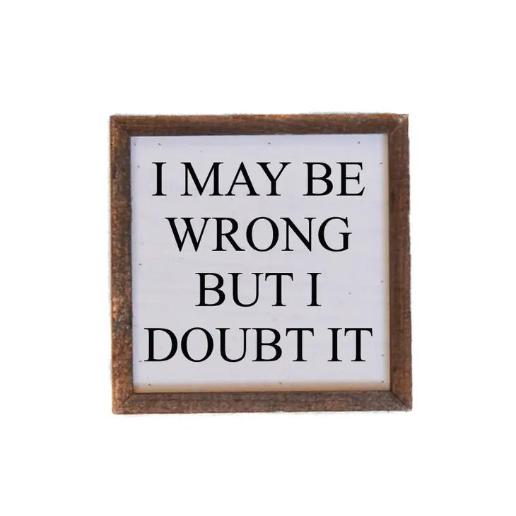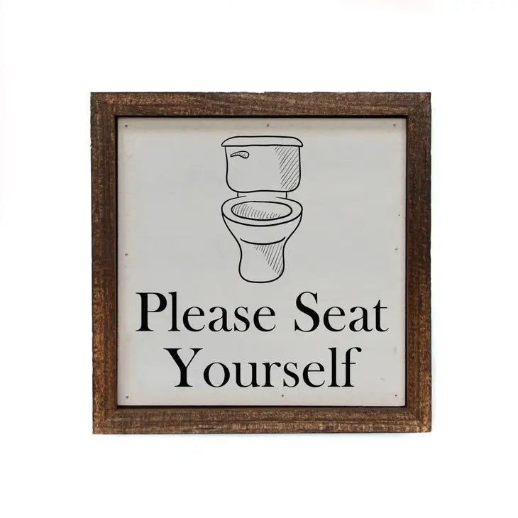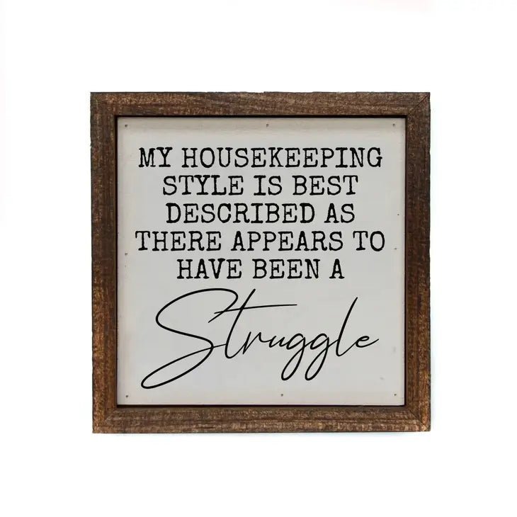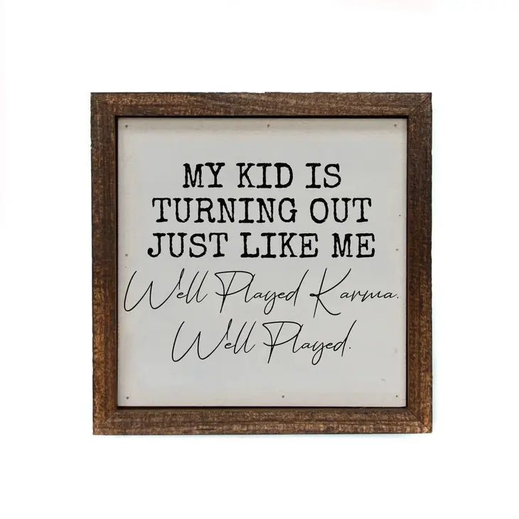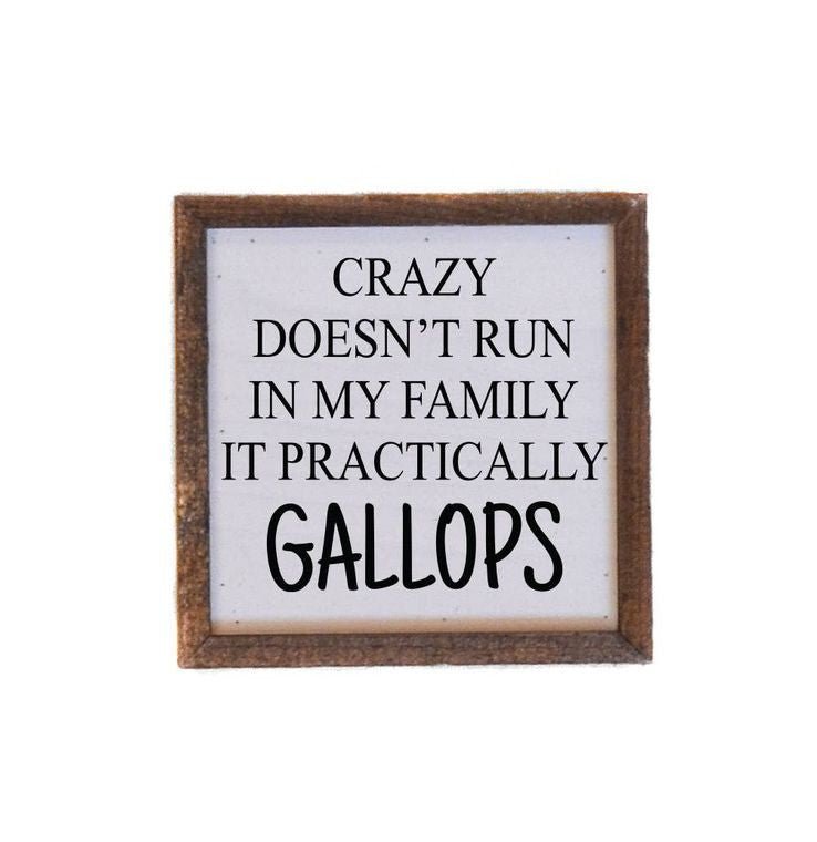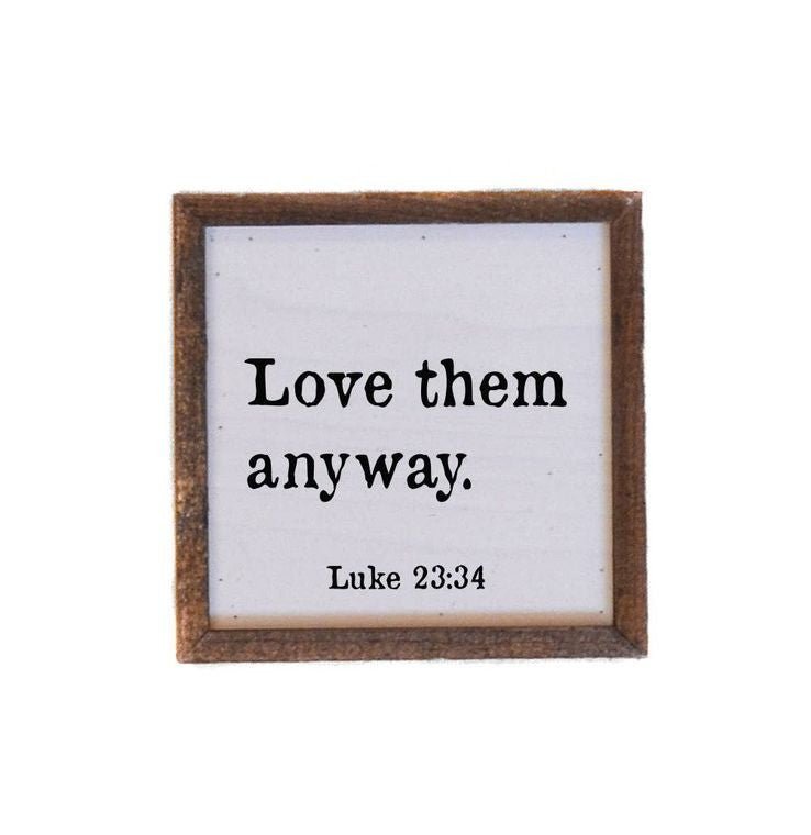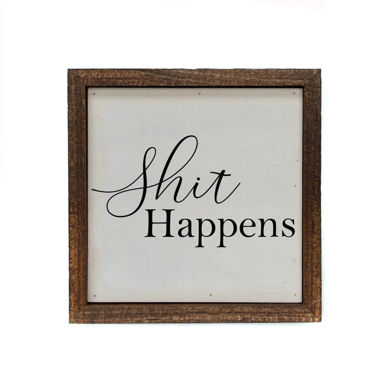Signs are built into a wooden box frame with a rustic touch and are hung directly off the frame or will stand up right on a table or shelf.