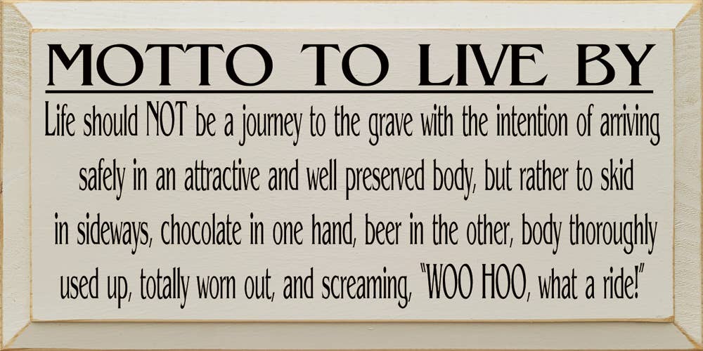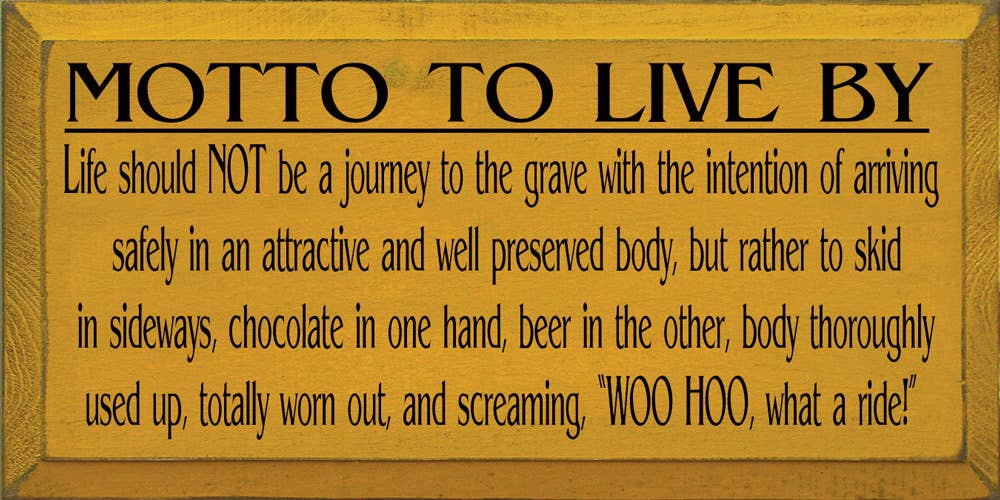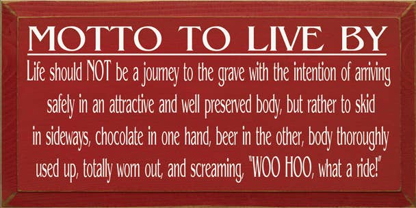 9x18" Motto To Live By: Life Should Not Be A Journey To The Grave With The Intention Of Arriving Safely In An Attractive And Well Preserved Body, But Rather To Skid In Sideways, Chocolate In One Hand, Beer In The Other, Body Thoroughly Used Up, Totally Worn Out and Screaming "WHOHOO" What a Ride. Sawdust City signs are made from solid knotty pine, so please allow for slight imperfections - as wood is imperfect by its nature - but only adds to the character of the product. It is intended to have a rustic, old look and feel. Expect knots, variance in color, and natural cracks - as well as small edge “dents” or chips.