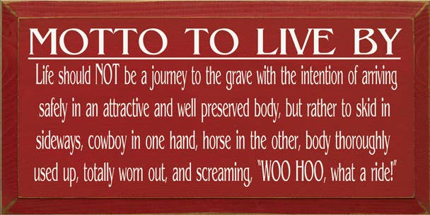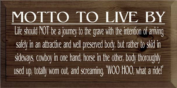 9x18" Motto To Live By: Life Should Not Be A Journey To The Grave With The Intention Of Arriving Safely In An Attractive And Well Preserved Body, But Rather To Skid In Sideways, Cowboy In One Sawdust City signs are made from solid knotty pine, so please allow for slight imperfections - as wood is imperfect by its nature - but only adds to the character of the product. It is intended to have a rustic, old look and feel. Expect knots, variance in color, and natural cracks - as well as small edge “dents” or chips.