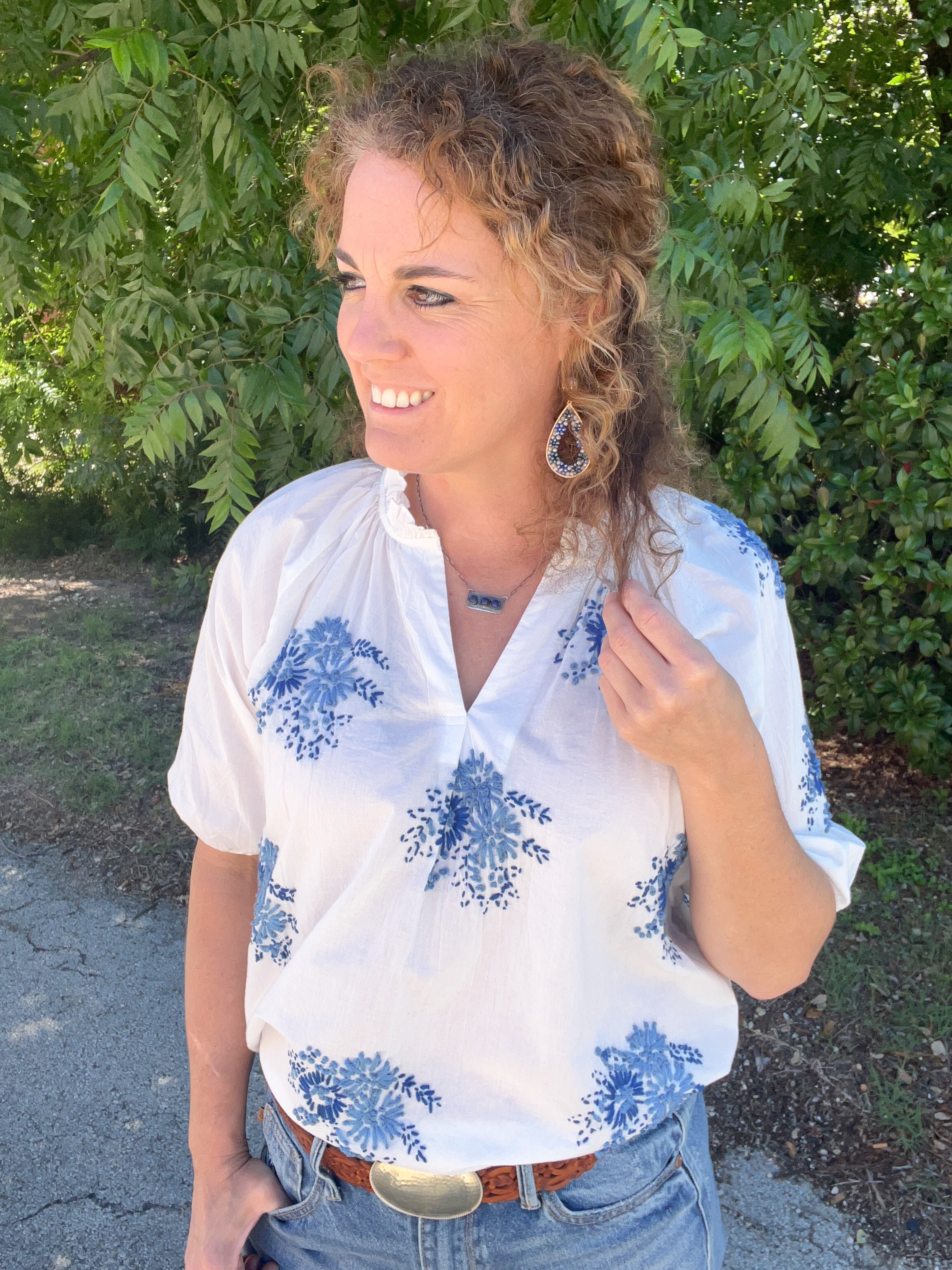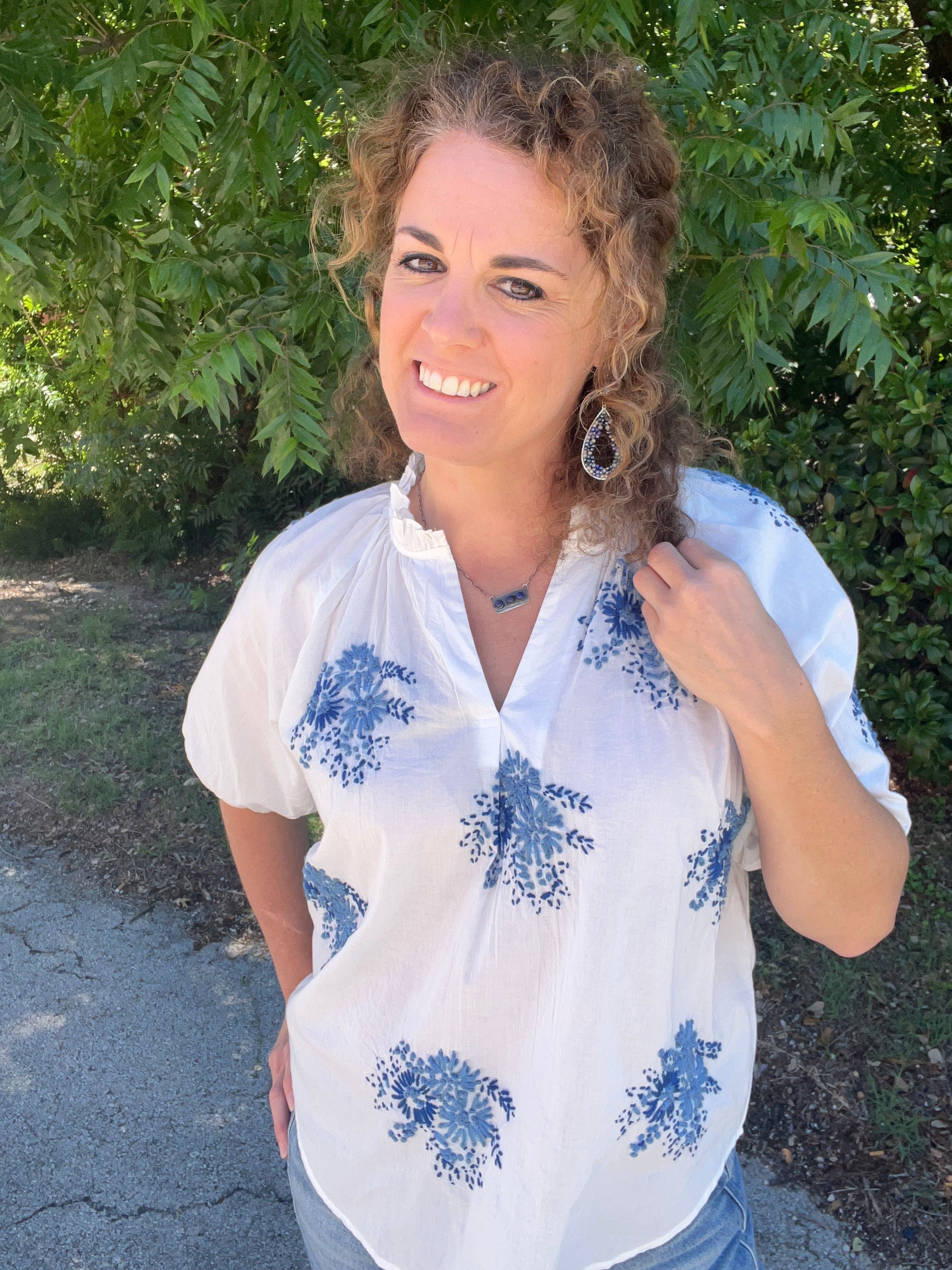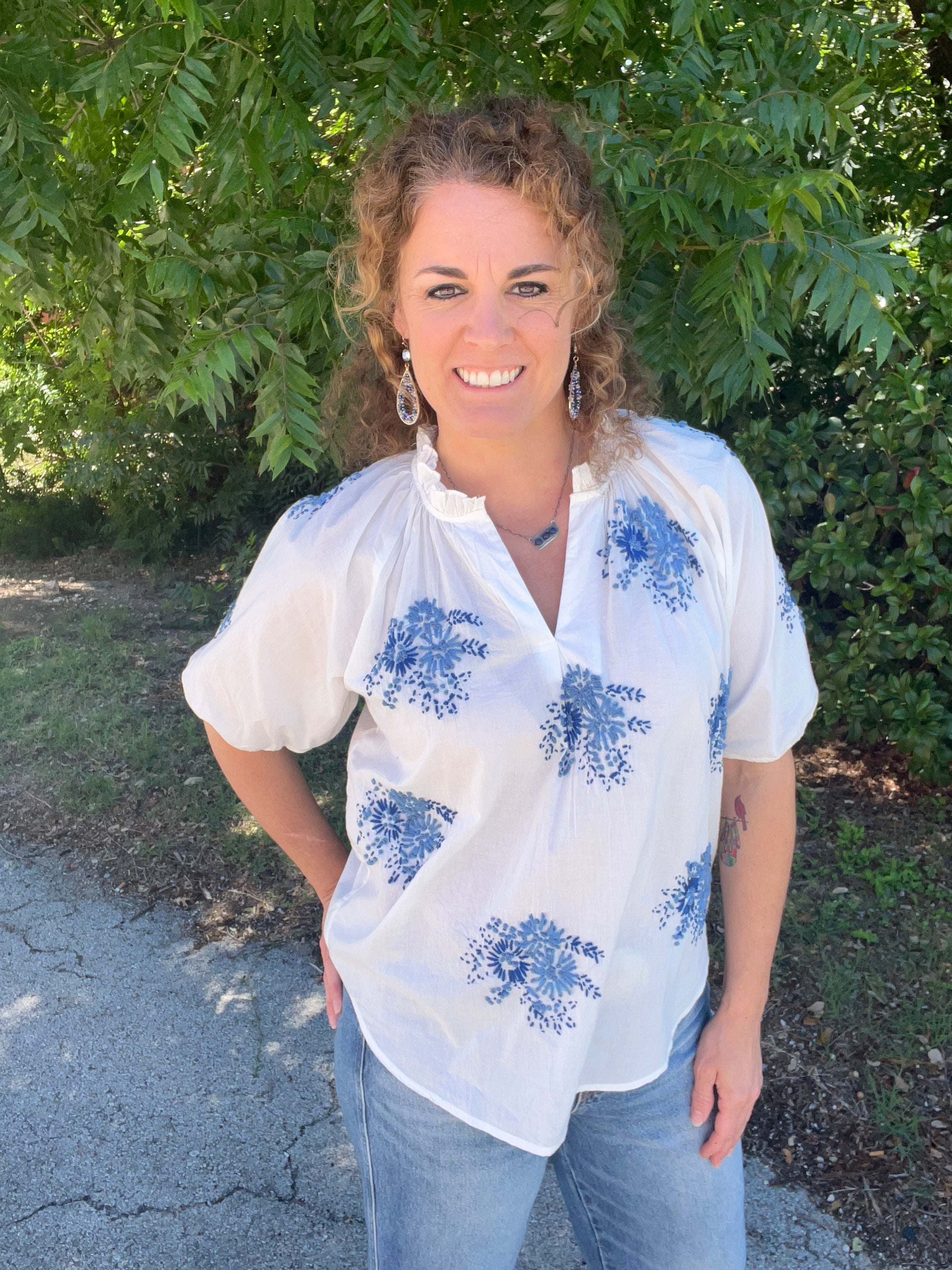 Get ready to rock this summer with the Anita Blouse! Made from breathable cotton, this v-neck blouse features short sleeves and a stylish white with blue embroidery design. The curved hemline adds a modern touch to this classic piece. Perfect for any occasion, this blouse will keep you cool and stylish all season long. Don't miss out!