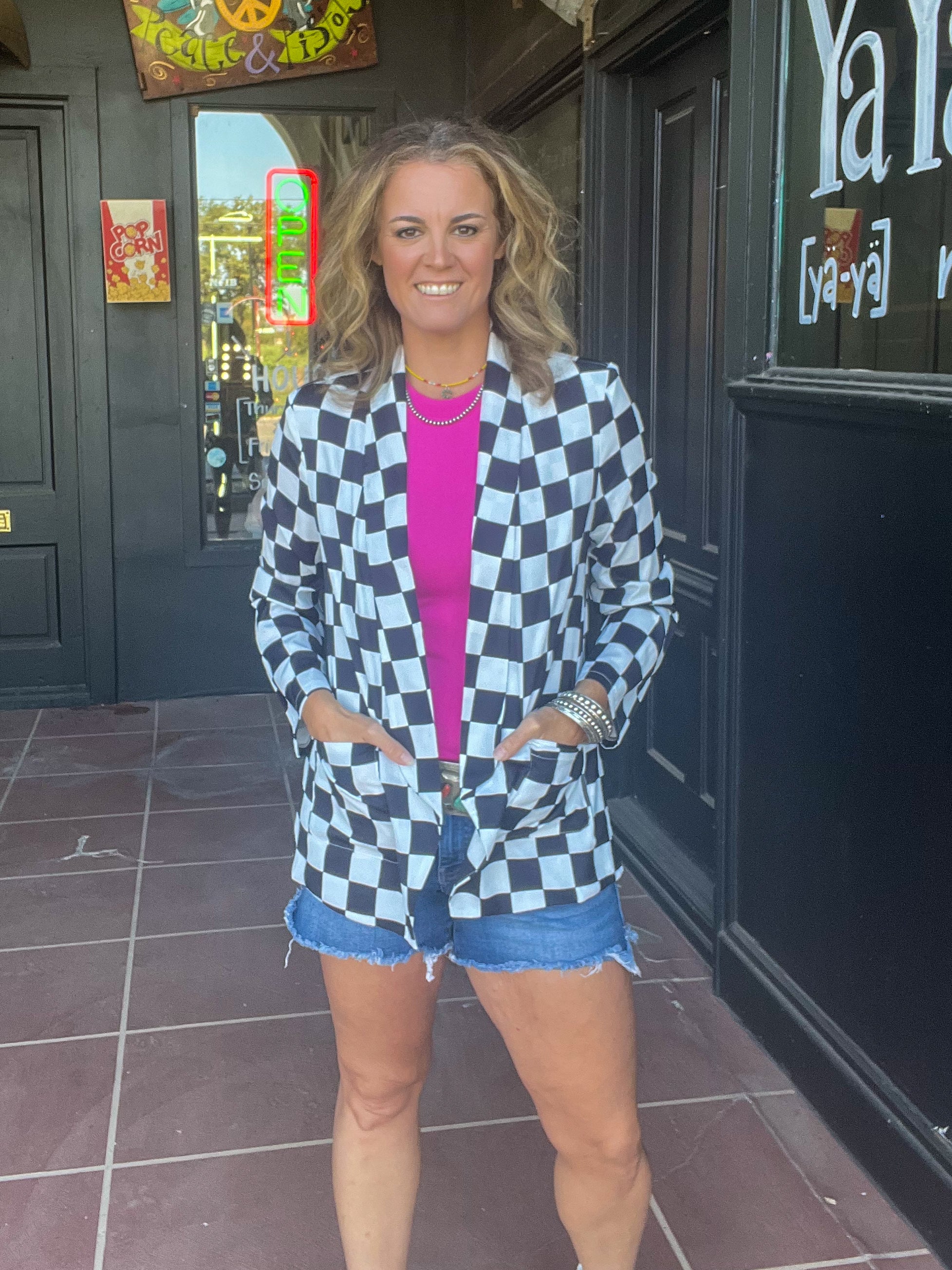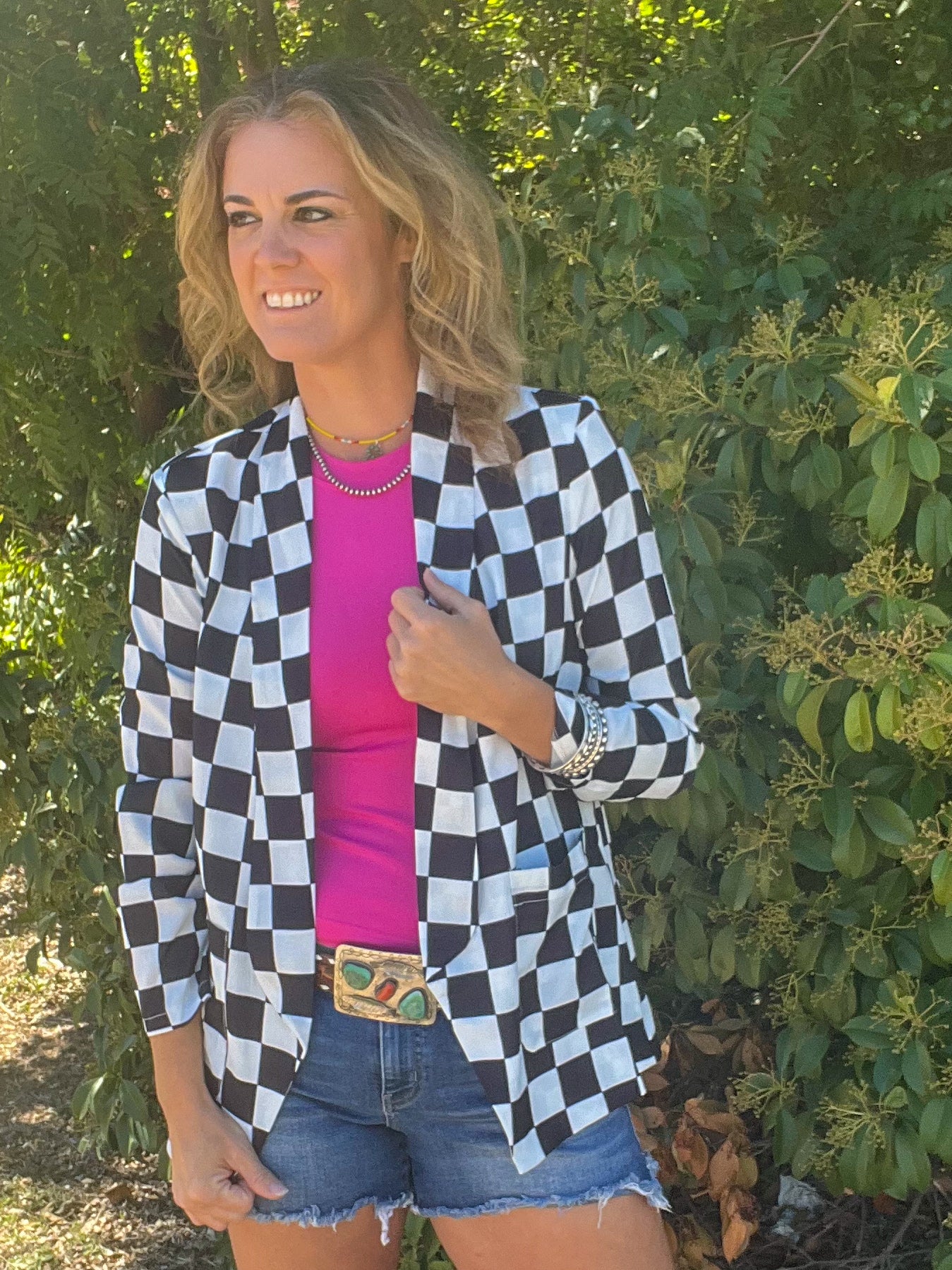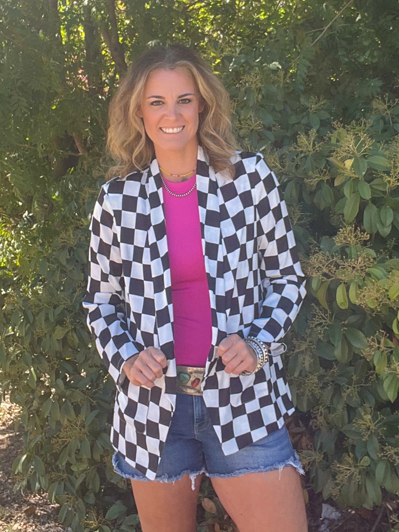 Step up your style game with our Black & Checker Blazer! This blazer features a classic black and white checkered pattern, adding a touch of fun and personality to your outfit. Perfect for any occasion, this blazer is sure to make a statement.