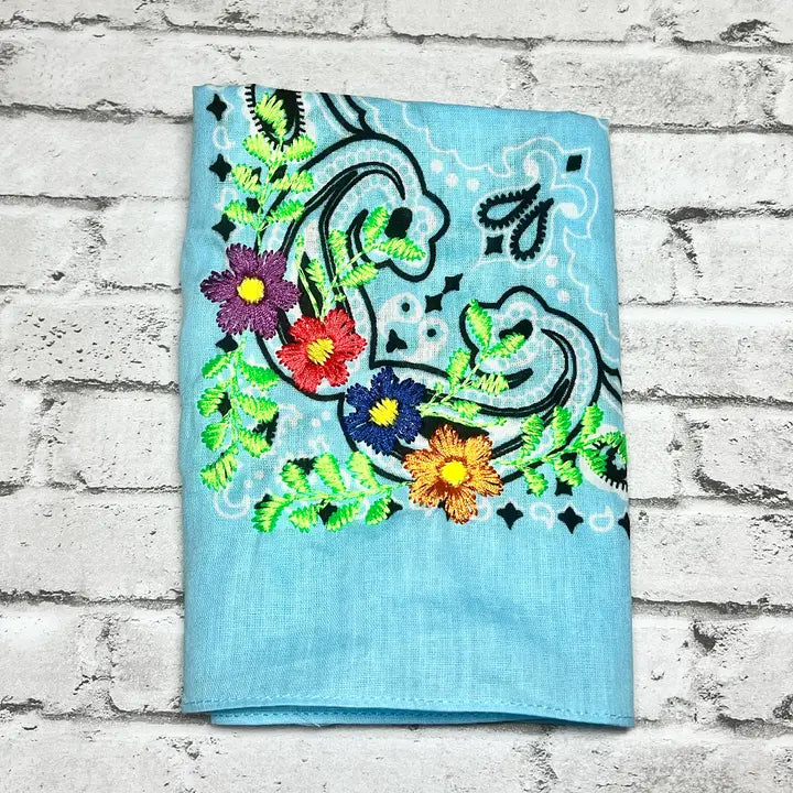 Beautifully embroidered bandanas/scarves are wonderful accessories to add to any wardrobe. Wear around your neck, on your hair or tie it off as a purse or tote bag accessory. These also make great pet bandanas. Wonderful gift item. Sold in an assortment of 5 various colors.