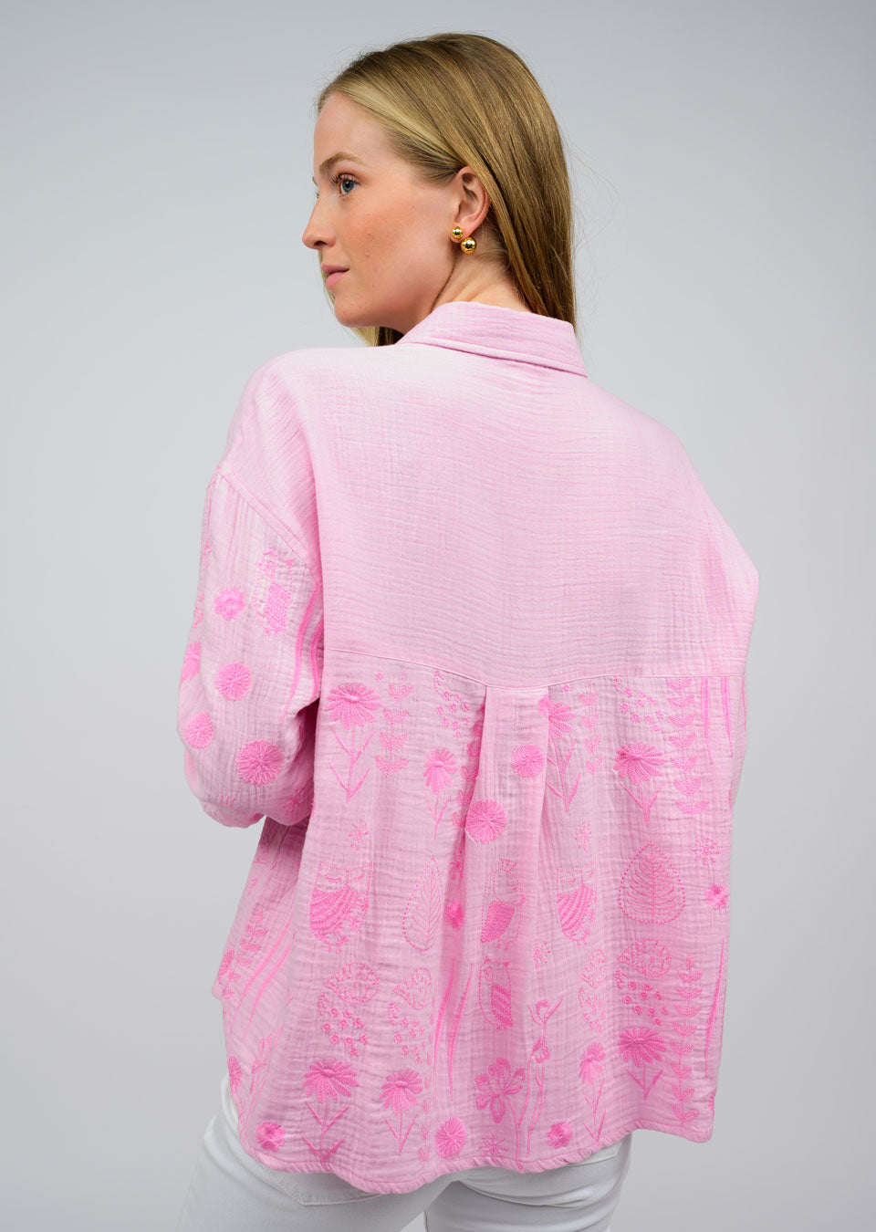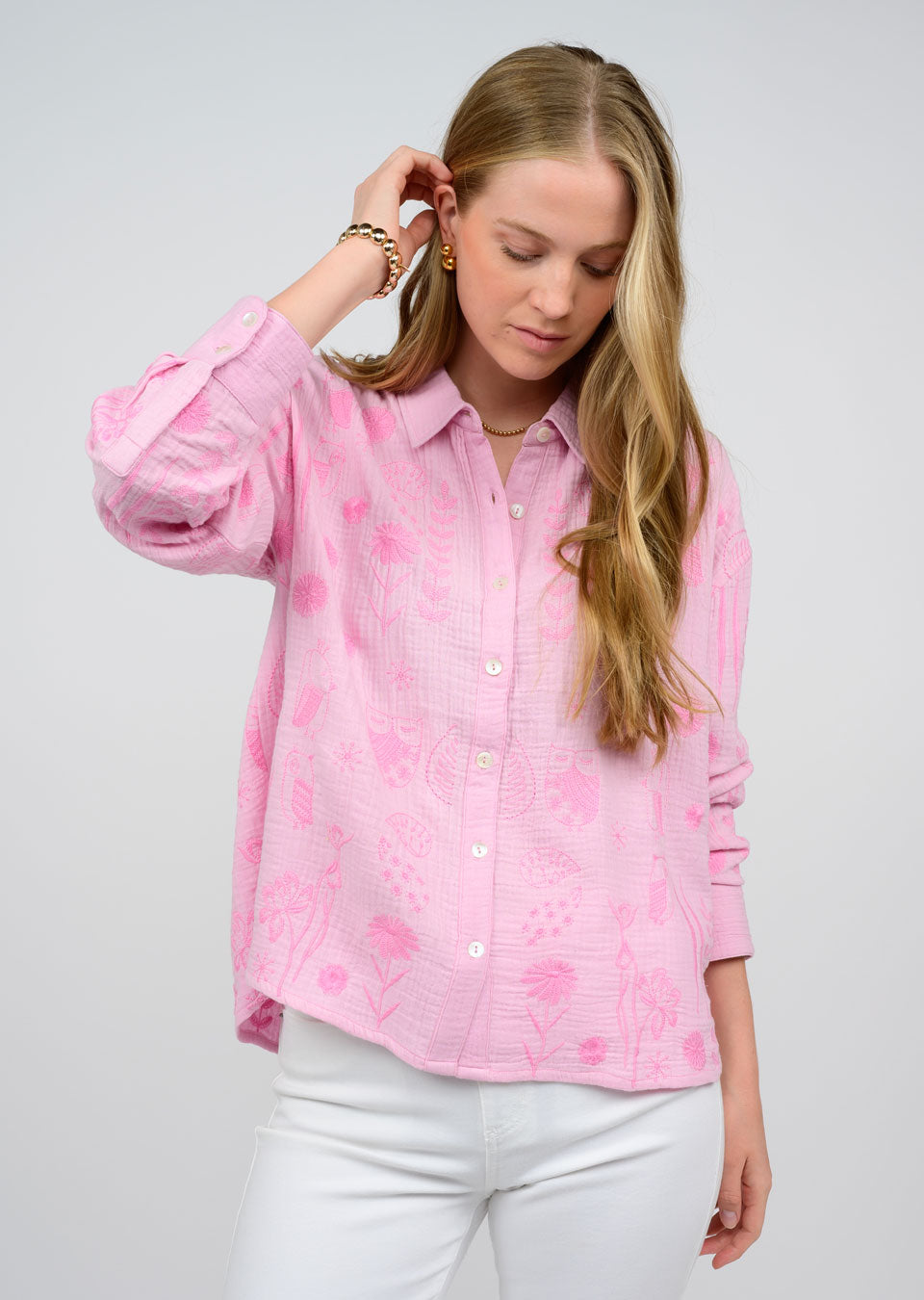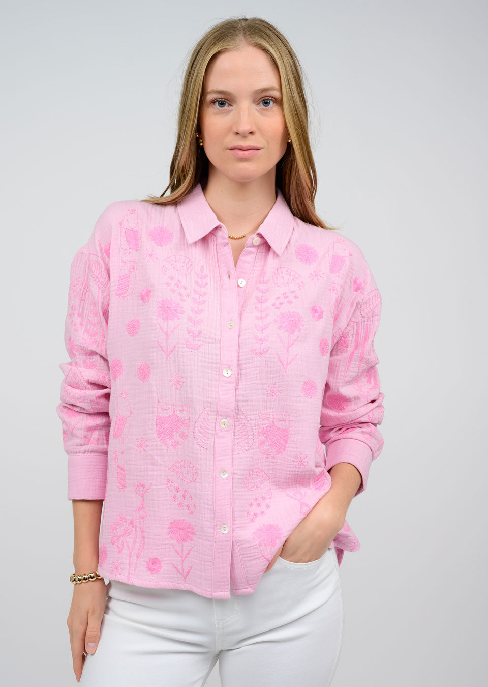 Fly into spring with our Flock of Birds Shacket! Made of 100% cotton gauze, this soft pink button-down features all-over embroidery for a playful touch. Perfect for a casual yet stylish look, with long sleeves and a collared neckline.