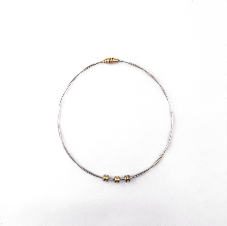➺The Karma Bangle is composed of steel guitar strings with 3 brass guitar string ball endings and non-tarnish gold jewelry wire