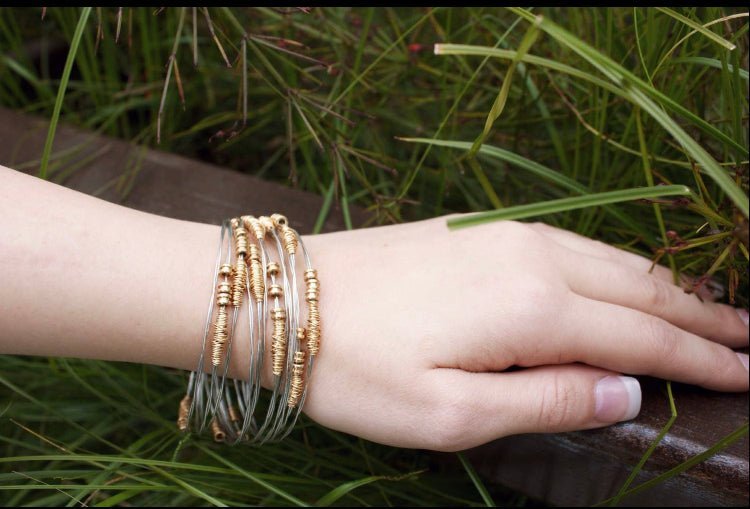 What goes around comes around! ReStrung's Karma Bangle is made from electric guitar string, wound around several times for a thicker bangle. This mixed metal bangle features three ball endings (the end bits of the guitar string) which represent your past, present and future all coming full circle. This versatile bangle looks great in a stack but also mixes well with your other wrist candy. Pair with your other gold and silver jewelry for endless style possibilities. Recycled Guitar String Jewelry from New Orleans! Each piece is made lovingly by local women of New Orleans using strings from some of the most talented musicians of the South!