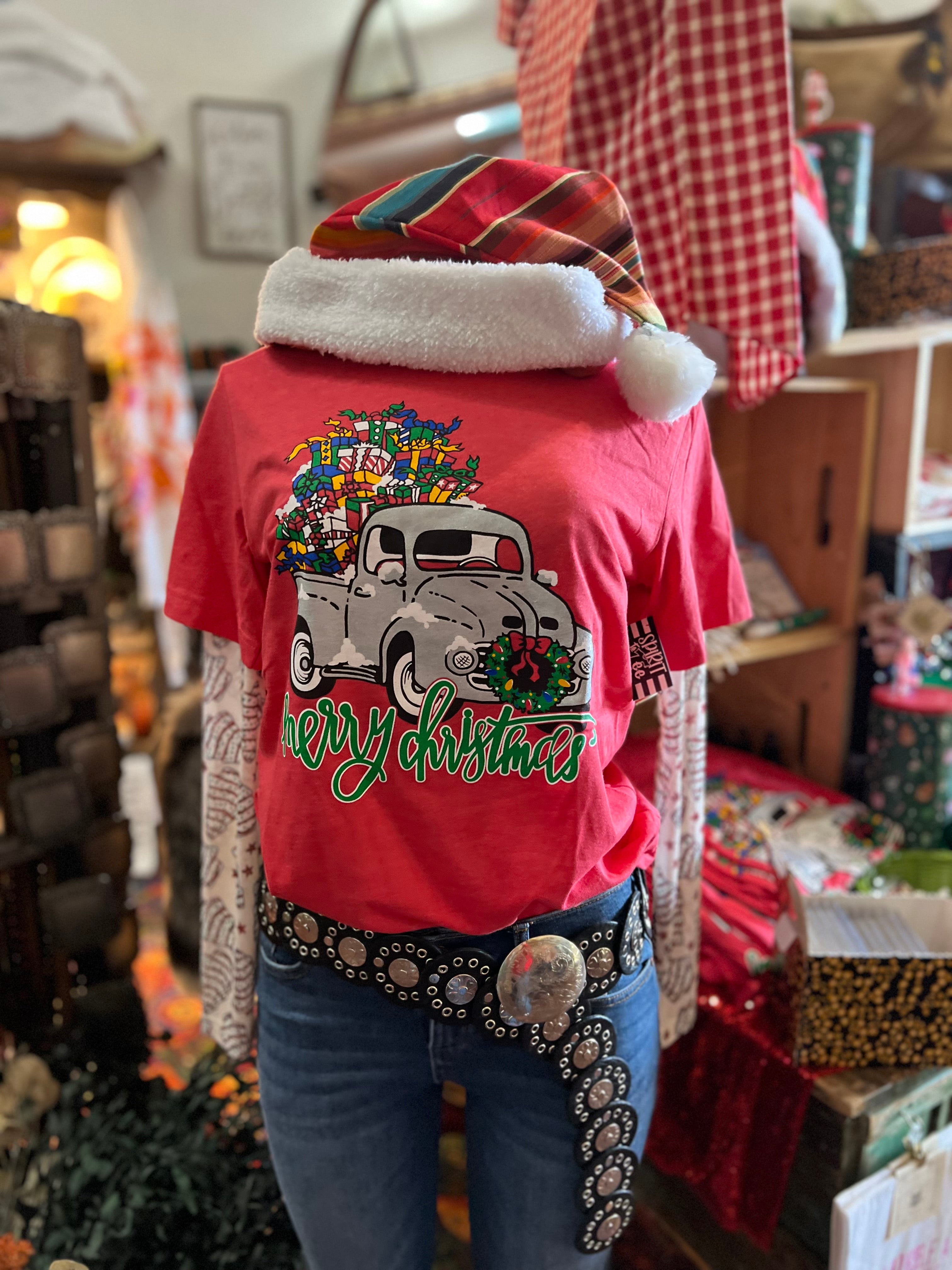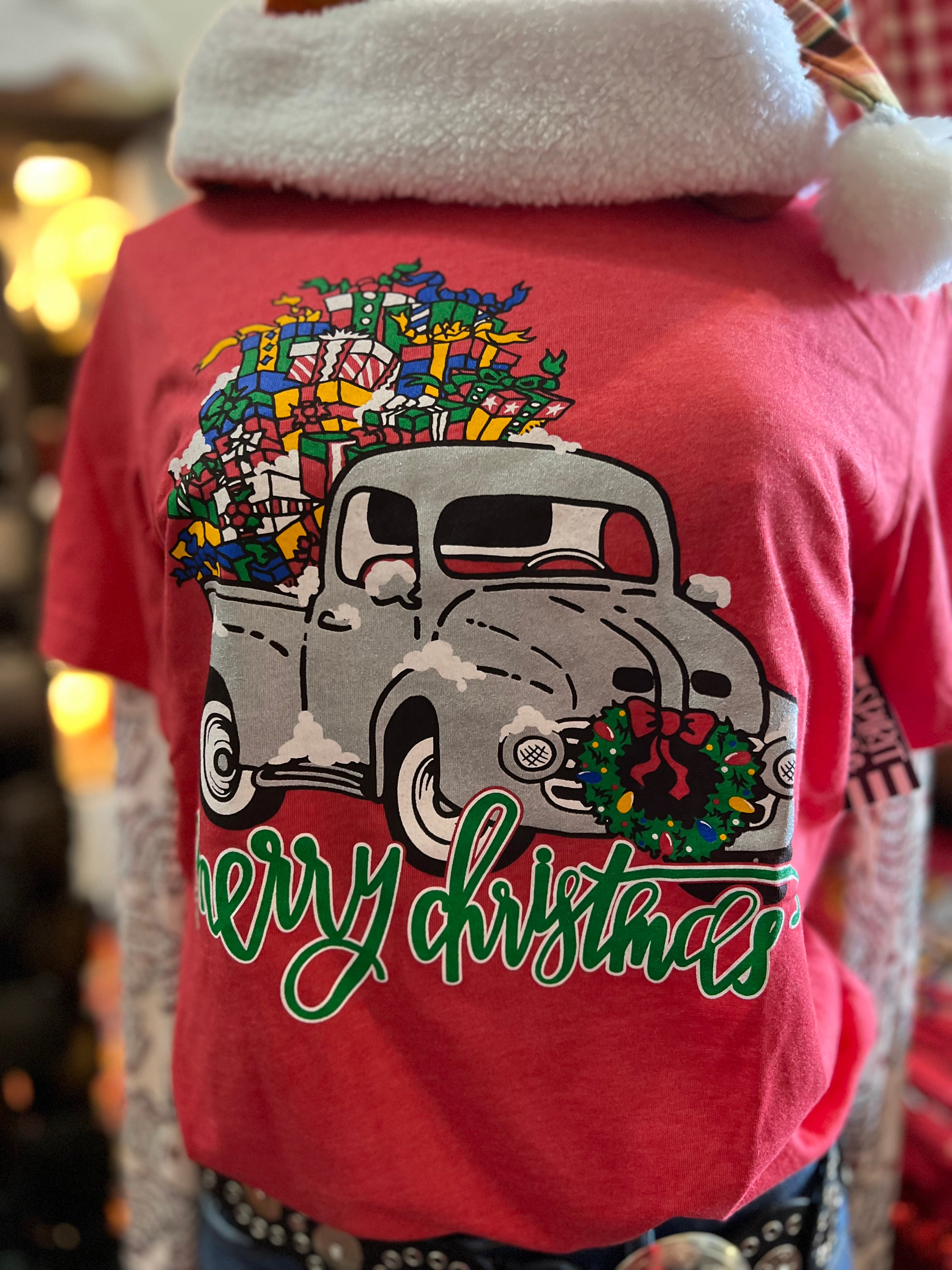 Get into the holiday spirit with our Merry Christmas T-Shirt! Featuring a festive truck and presents, it's the perfect addition to your winter wardrobe. Spread some cheer and look stylish doing it. Let this playful shirt be your go-to for all your holiday gatherings.