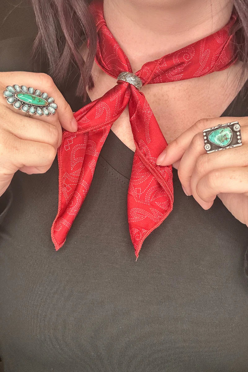 Wrap your neck in wild style with this Mini Stitched Out Wildrag. The red silky fabric adds a touch of luxury, while the cream boot stitch design adds a playful twist. Stay cozy and chic in any outfit. Yeehaw!