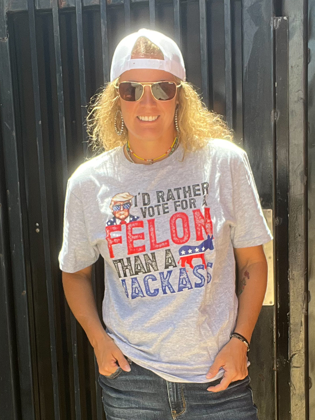 Embrace your rebellious side with our Rather Vote for a Felon T-Shirt! Made with superior quality and incredibly soft Bella Canvas material, this black t-shirt features a daring "dtf" print that will make a bold statement. Perfect for those who aren't afraid to stand out and challenge the status quo.