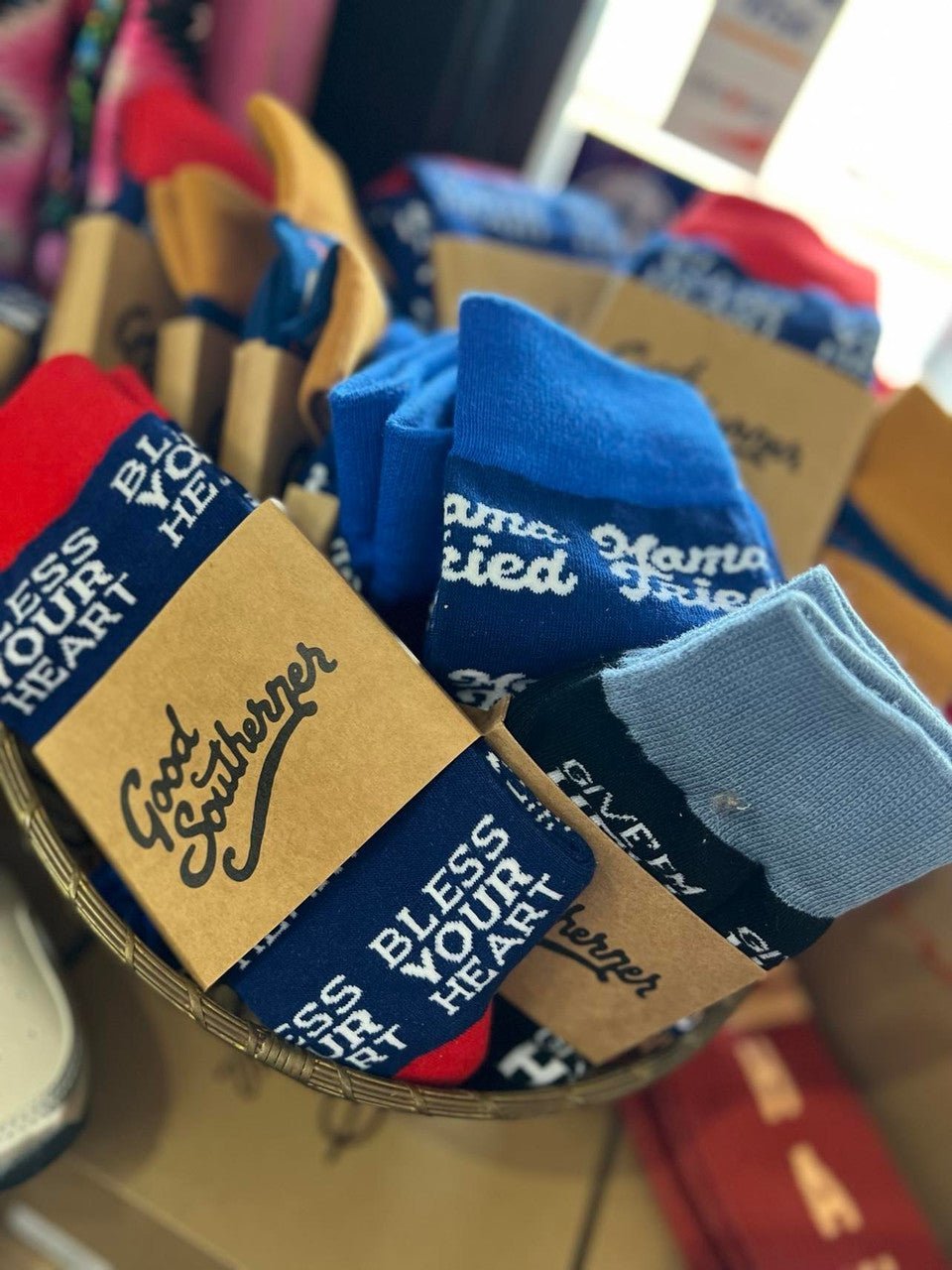 It's the most universal of Southern sayings, and now we have your tootsies covered with some Bless Your Heart socks in Navy/White/Red.