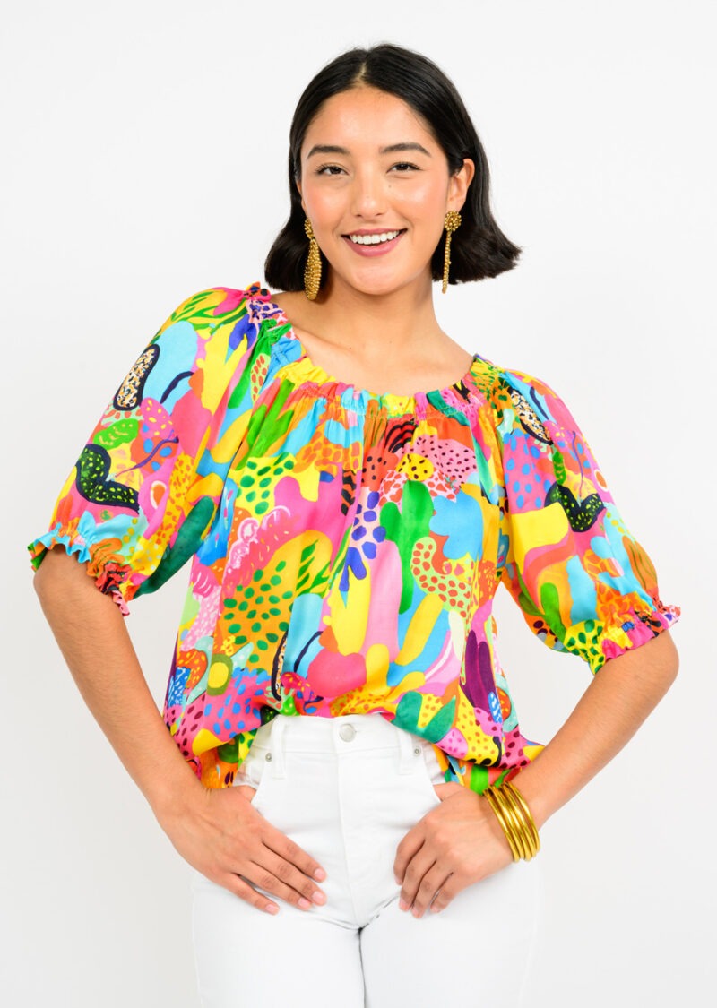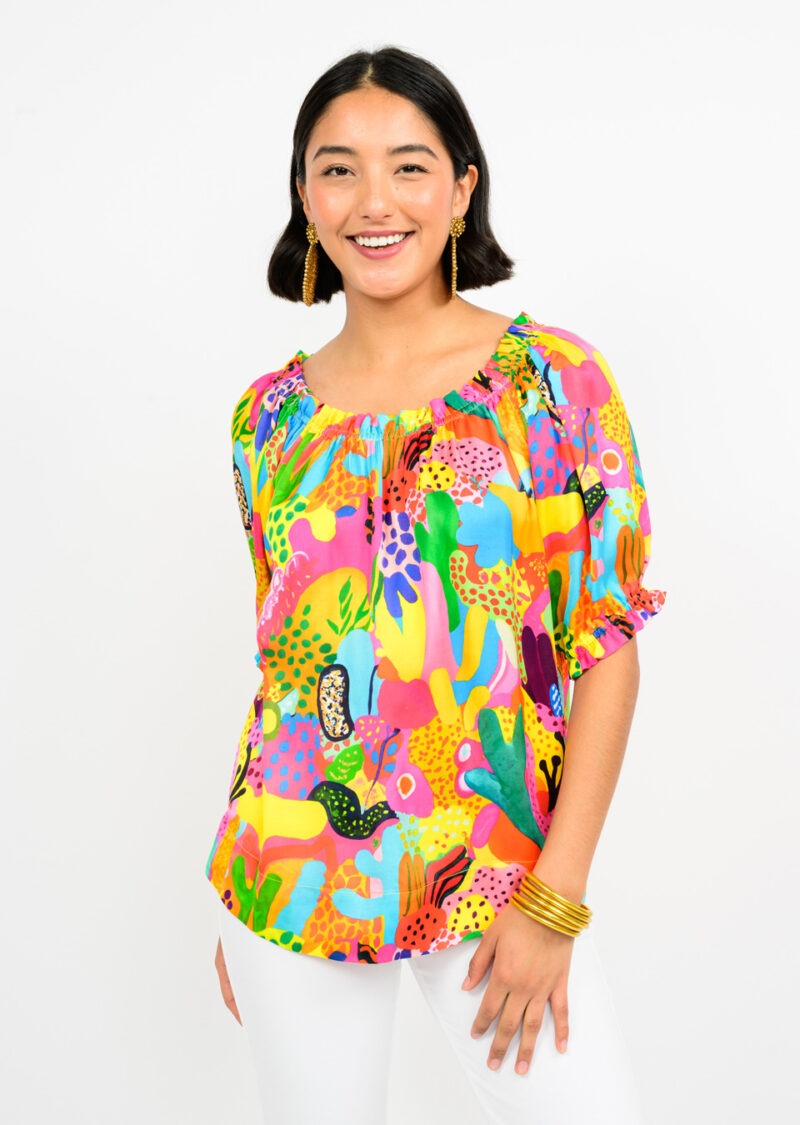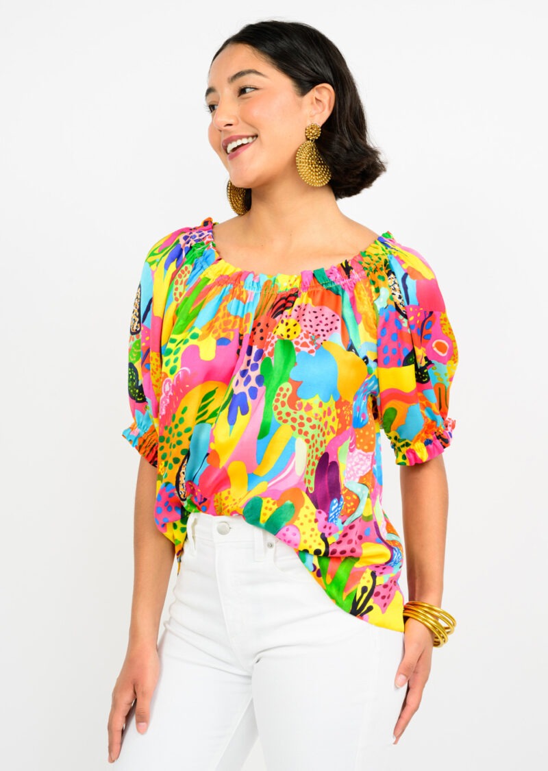 Add some quirky style to your summer wardrobe with the Tropical Satin Cactus Top from Ivy Jane. Featuring a fun tropical satin print and colorful cactus design, this top is sure to turn heads. Stay cool and stylish all season long! (Cactus not included).
