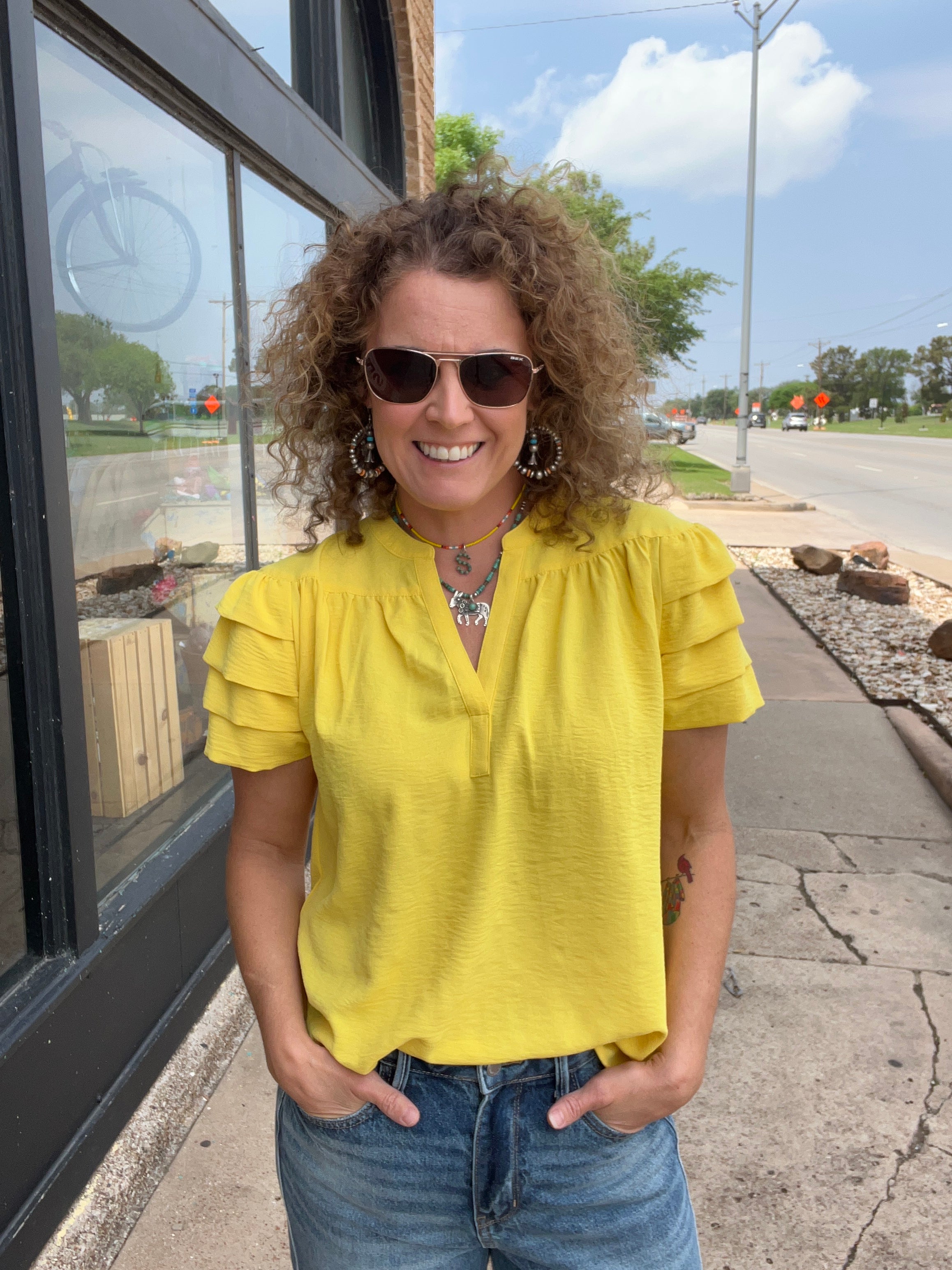 Introducing the Tucked Sleeve Popover from Ivy Jane! This playful lemon spring top will add a pop of color to your wardrobe. Featuring tucked sleeves, this quirky piece is perfect for someone who loves to stand out and have fun with their fashion. (Warning: may cause "where did you get that" inquiries!)