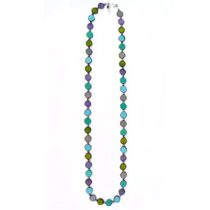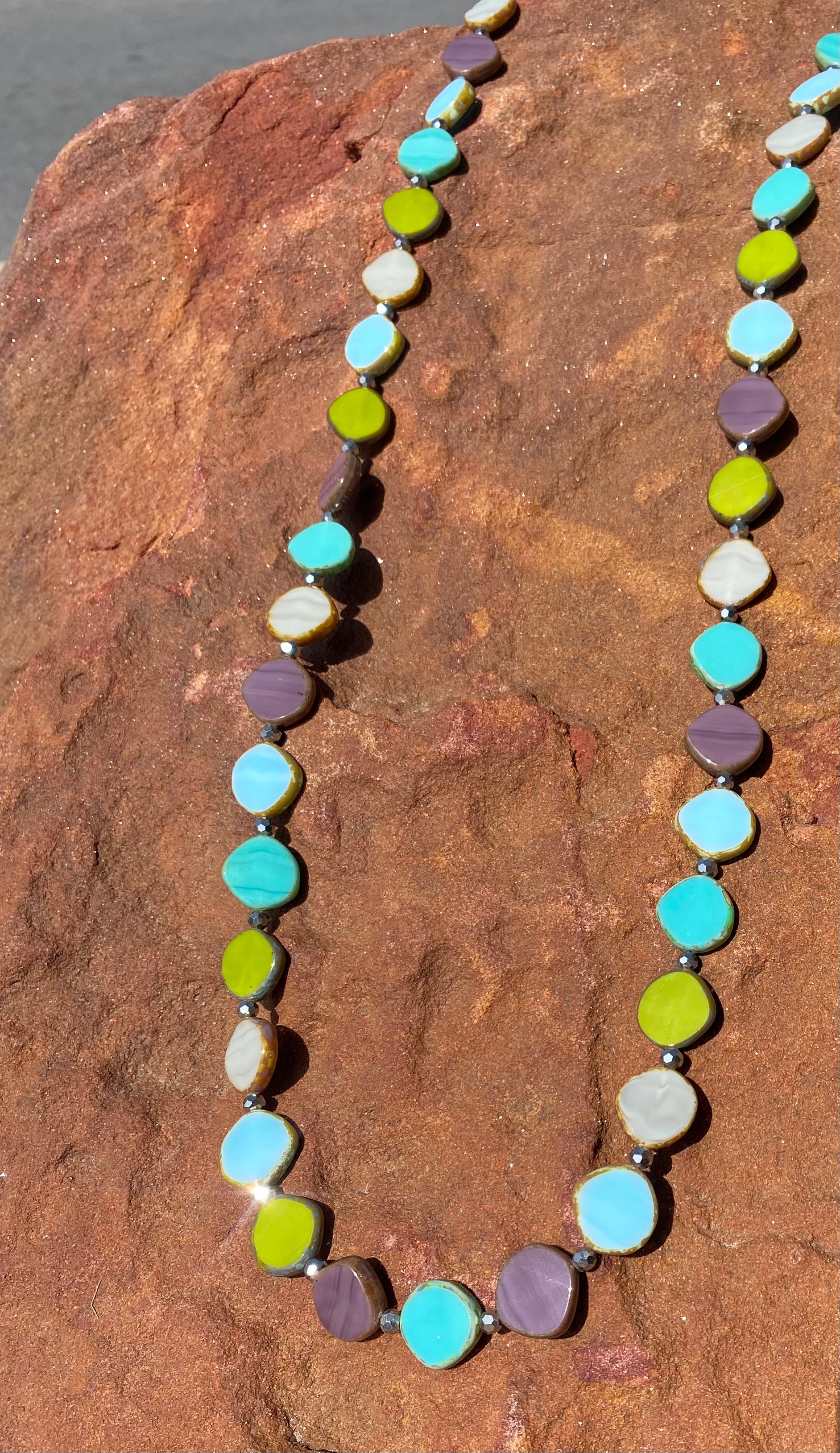 Cheerful circles in a rainbow of vibrant colors. Czech glass beads in organic round shapes. Beads are just over a half of an inch in diameter. Wear long or doubled. Sterling silver lobster closure and chain, adjusts from 36 to 38".