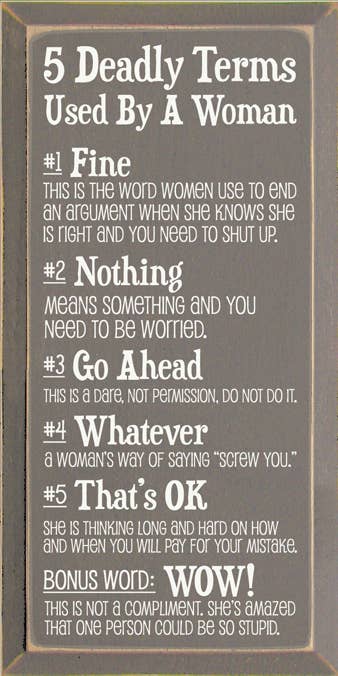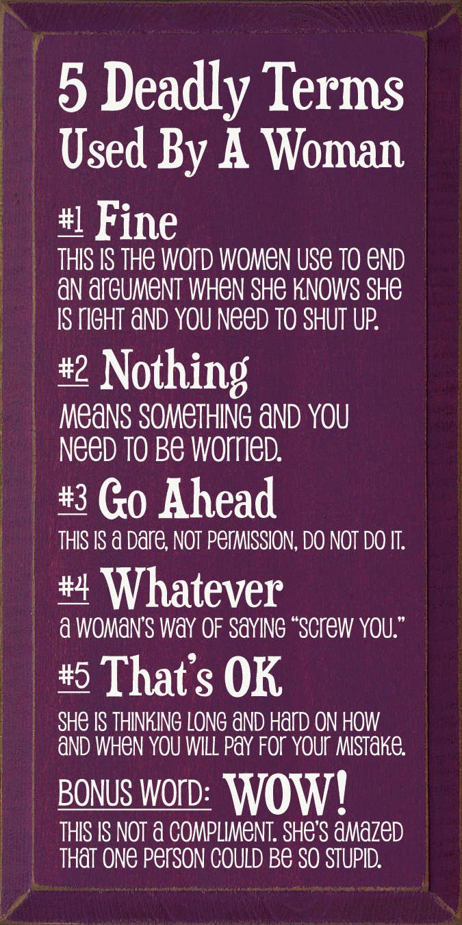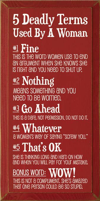 9 x 18" - 5 Deadly Terms Used by a Woman Vertical Wood Sign