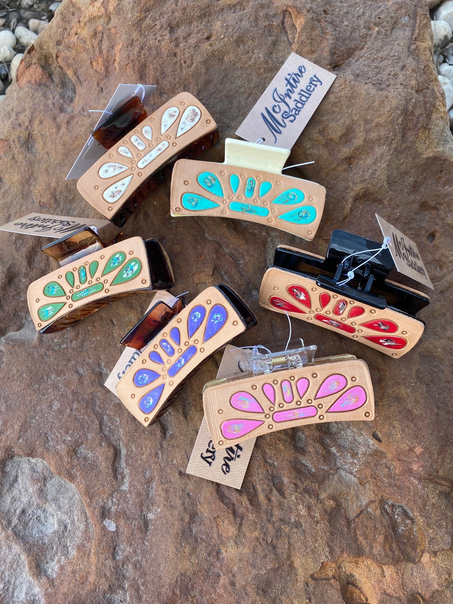 Leather stamped hair claw.
